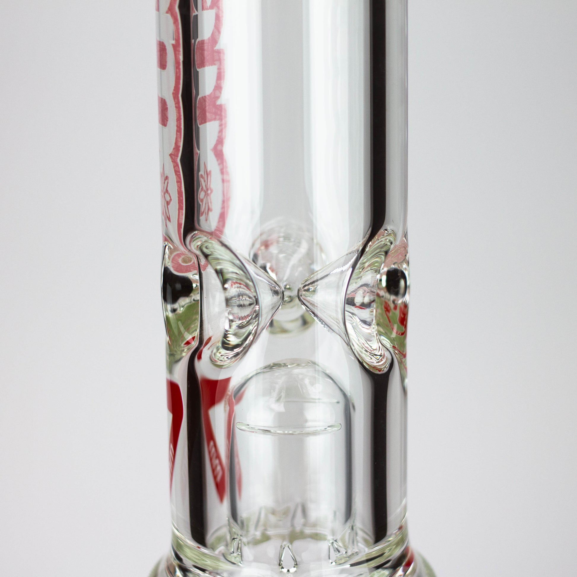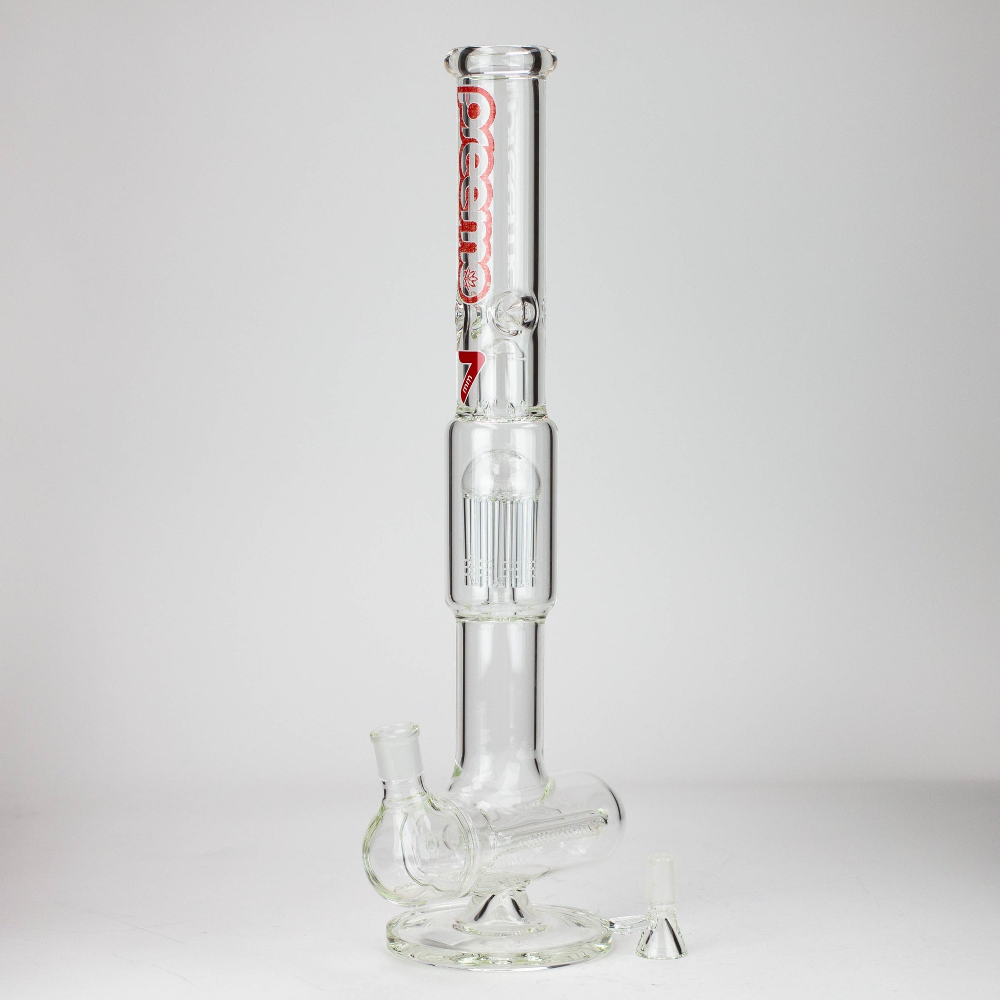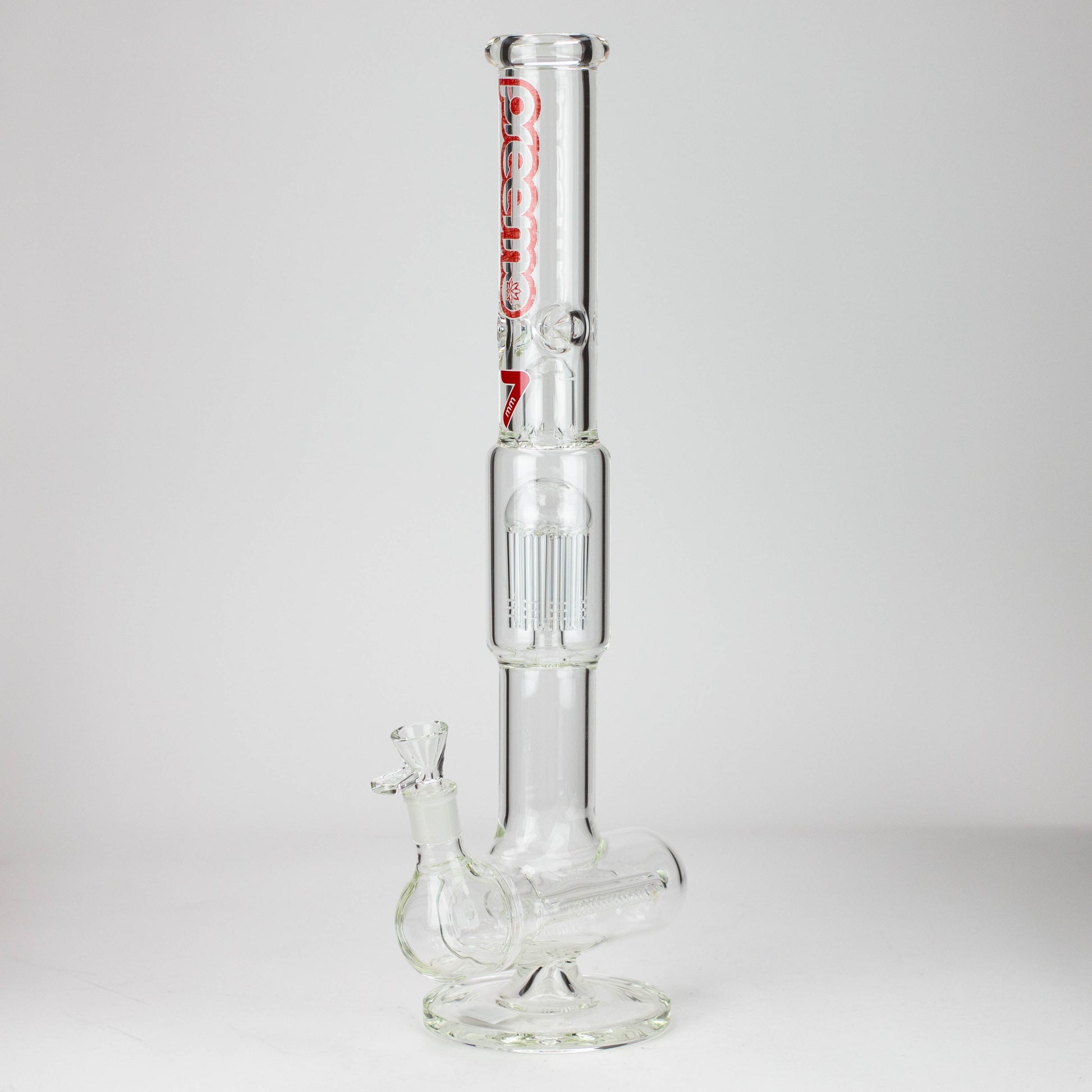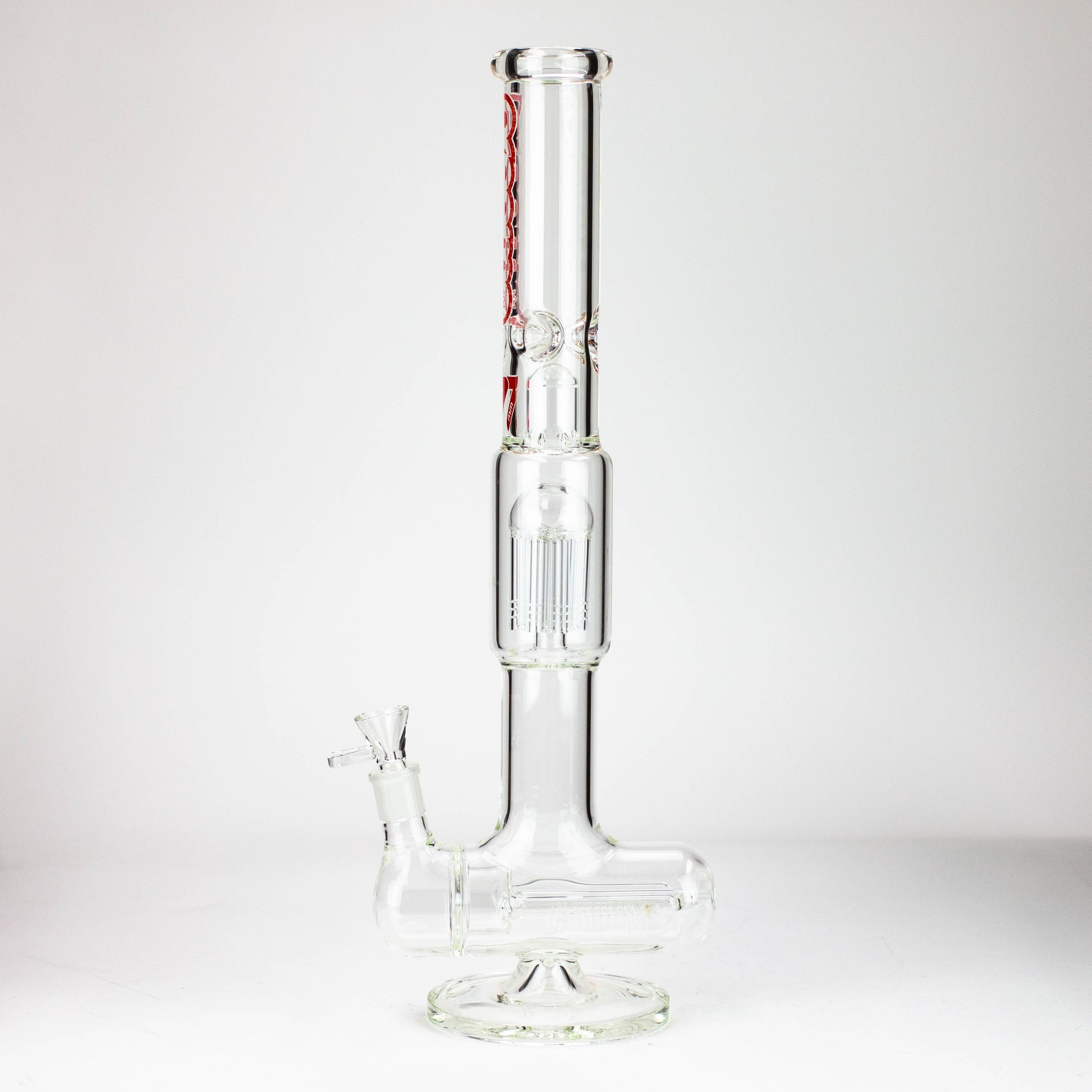 Tall dome over 8-arm tree and triple inline percolators. Clear borosilicate glass with a range of logo color options.