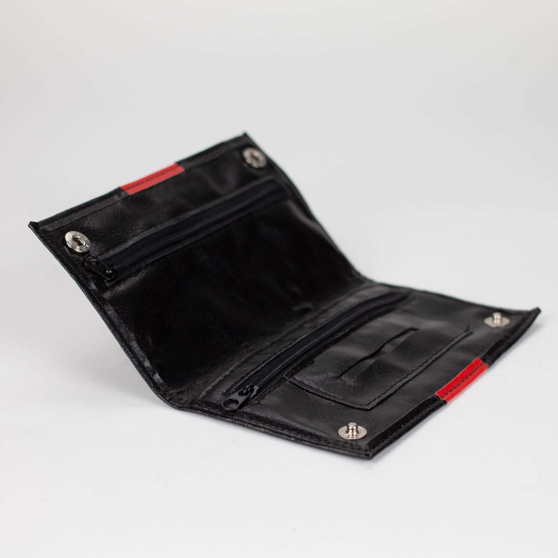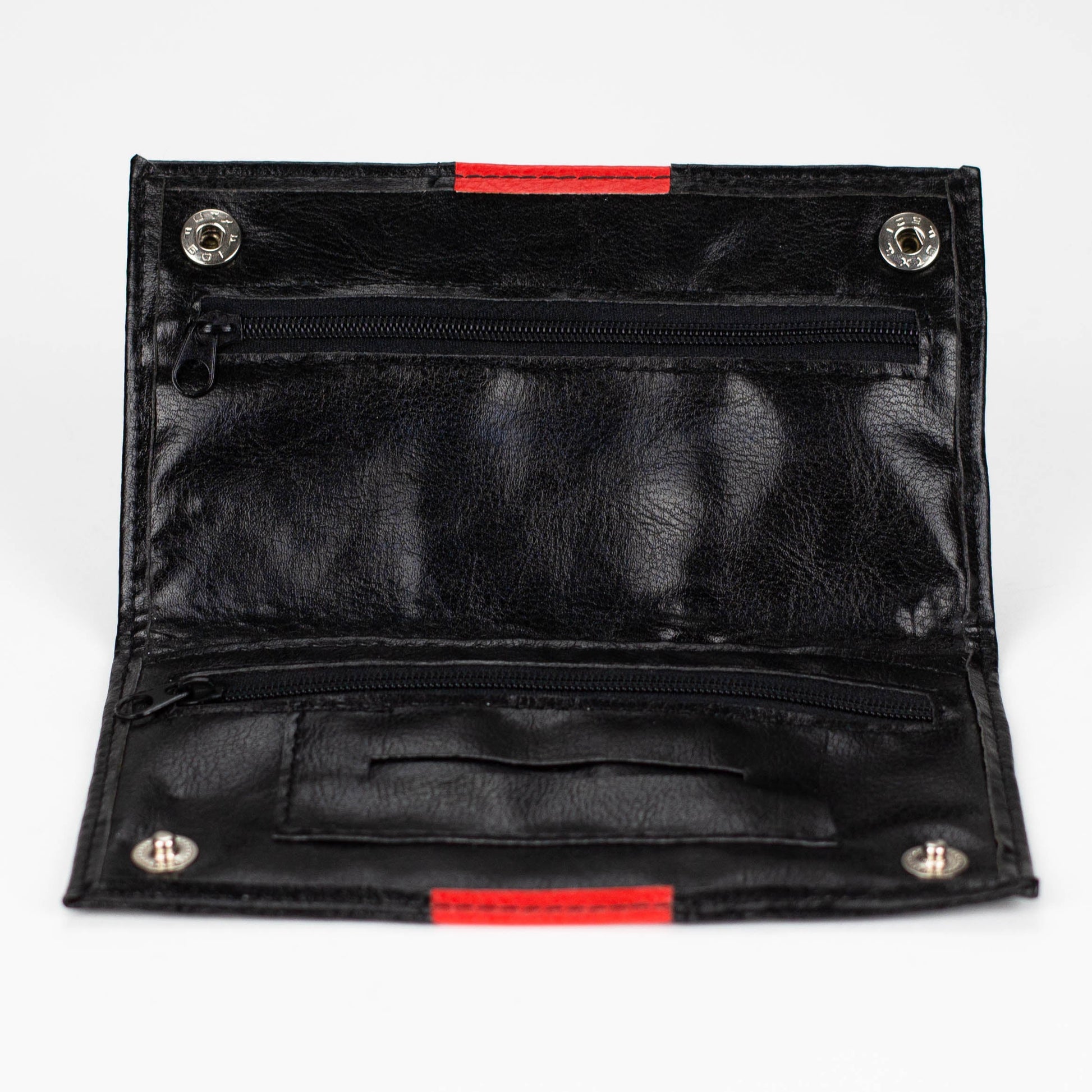 It has two inside pockets, the pocket with zipper is for the hemp and the front pocket is for the filter-tips and lighter. The paper holders are of course also attached.